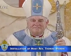 Archbishop Wenksi made his remarks at the afternoon installation and ordination Mass at the Cathedral of St. Mary in Miami, where earlier he was received by a throng of cheering attendees as the liturgical procession made its way inside. At the beginning of the Mass, Archbishop Pietro Sambi, the Apostolic Nuncio to the U.S., read the Holy Father's greeting and appointment of Archbishop Wenski as shepherd of the archdiocese's 1.3 million Catholics.