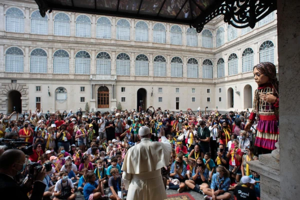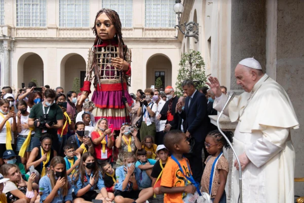Pope Francis welcomed a giant puppet symbolizing unaccompanied refugee children to the Vatican on Friday.