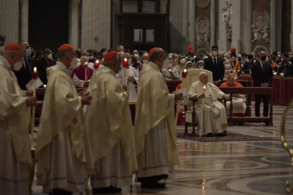Re and the concelebrating cardinals, bishops, and about 200 priests processed through the dark church carrying lit candles to signify the light of Christ coming to dispel the darkness.