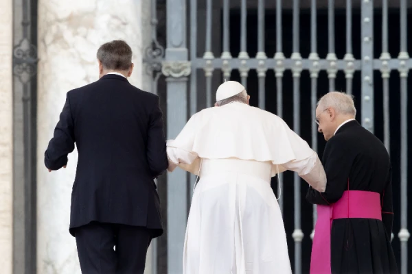 The 85-year-old pope, who is reportedly receiving therapeutic injections for his knee injury this week, required assistance as he slowly hobbled up a ramp to reach the chair where he sat for the general audience.