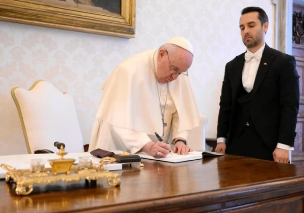 Francis received the new ambassador of Turkey to the Holy See, Ufuk Ulutaş, at the Vatican on Feb. 16. During the meeting, the pope also hand-wrote a brief message of encouragement to Turkey.