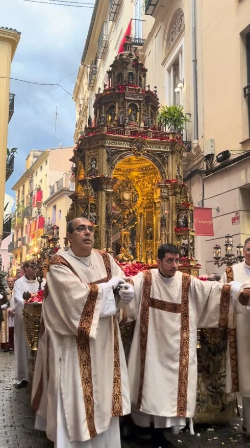During the Valencia procession, an umbraculum precedes the monstrance and a bell alerts those who are lining the streets that Jesus is about to pass by. Those filling the balconies prepare their flowers, and the eucharistic Lord is showered with red and white petals from two, three, five floors up.