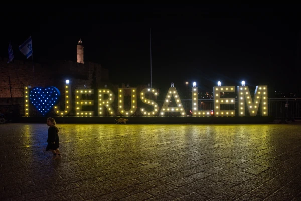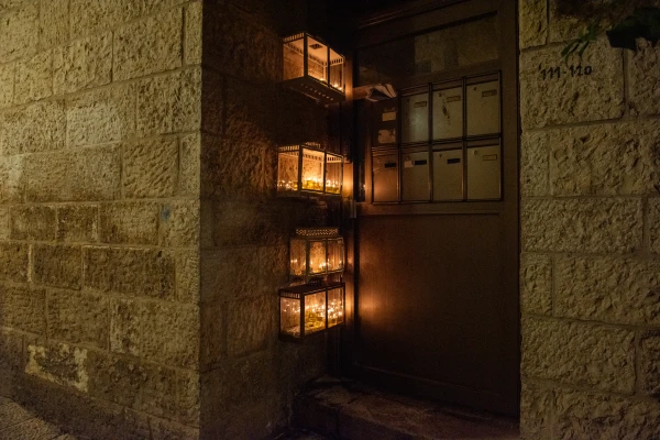 Even in the Jewish Quarter of the Old City of Jerusalem, the lights are fewer than usual. The municipality has arranged a special setup in front of Jaffa Gate, one of the main entry points to the Old City. In the plaza beneath the walls, the word “JERUSALEM,” composed of nine letters, has become a large hanukkiah/menorah.