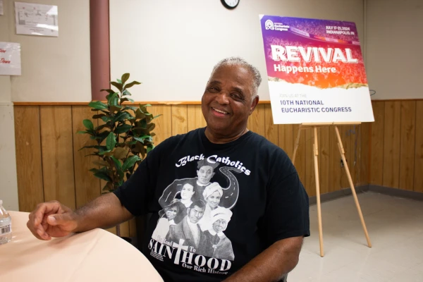 Augustus “Gus” Lewis has attended the church that is now part of St. Josephine Parish since he was 5 years old. He was present for lunch with the pilgrims and wore a shirt depicting the faces of several prominent African-American Catholics who are being considered for sainthood, including Father Augustus Tolton.
