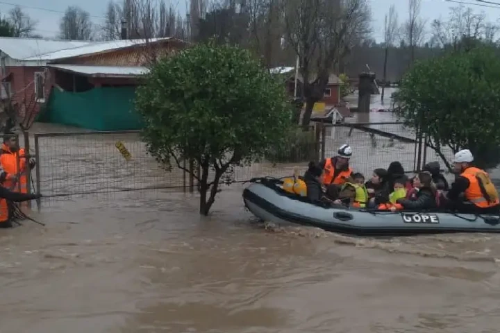 A frontal system has left the area inundated with heavy rains, causing the Maule River to overflow with at least two deaths and almost 10,000 people evacuated.