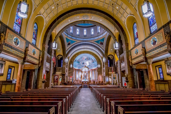 The interior of the church, meanwhile, includes murals by Marion Rzeznik, a Polish native born in 1899. Among its architectural features are a fully preserved ambo including the original abat-voix, a barrel-vaulted and coffered ceiling, statuary lining both sides of the pews, and the original ad orientem high altar over which is a rendering of the coronation of Mary, the Mother of God.