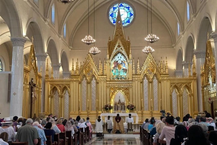 Those attending participated in a Eucharistic procession despite temperatures in the 90s. The procession began at the shrine’s Marian grotto and ended at the main church, where there was a healing service that included a reflection by Father John Eckert of the Diocese of Charlotte, North Carolina, on the role of shame in the Christian life.