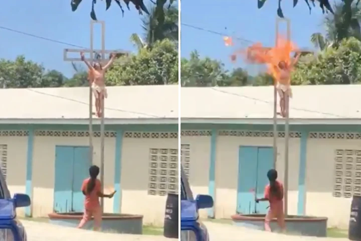A man on the Caribbean island of St. Lucia attempted on Sunday to set fire to a crucifix outside a Catholic church, while parishioners worshiped inside the building.