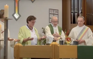 The laywoman stood at the altar in ordinary dress, with two priests beside her. She extended her arms and pronounced with them the words of the Consecration.