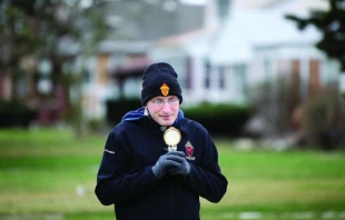In a photo from this spring, Fr. Bobby Krueger dons a black beanie, thick grey gloves, and a jacket with a hood over his clerics.