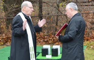In view of the tombstones and damp terrain of the large and rolling Old Cemetery at Calvary, a small crowd stood reverently as Bishop Robert Deeley prayed over the unclaimed and cremated remains of ten people.