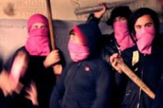 A report on the Bash Back group’s web site claimed credit for the protest. It described the outside protesters as a small group dressed in pink and black equipped “with a megaphone, black flags, picket signs and an upside-down pink cross.”