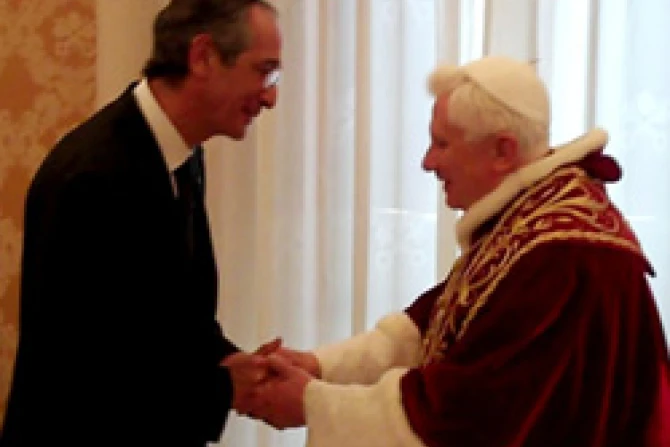 The Vatican said that the president's conversation with the Holy Father, and later Cardinal Secretary of State Tarcisio Bertone and secretary for the Secretariat of State Archbishop Dominque Mamberti, was highlighted by comments on the "good relations" the Church enjoys with the State in Guatemala and the contribution of the Church to the nation's development.