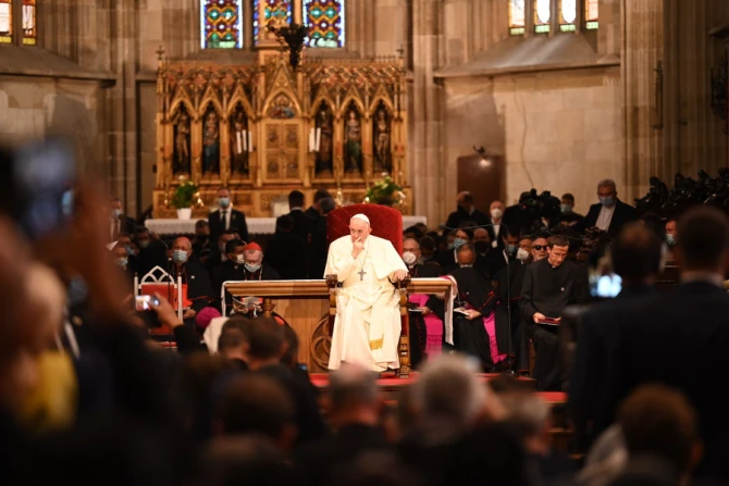 Slovakian bishops, priests, religious, seminarians, and catechists listened on headsets to a live translation of the speech, which the pope delivered in Italian, frequently stopping for off-the-cuff remarks on everything from the Russian writer Fyodor Dostoevsky to the importance of short homilies.