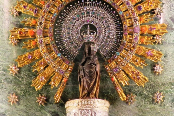 The wooden statue is a relatively simple image 15 inches high, standing on a jasper pillar 5.9 feet tall. But the crown adorning her head is a masterpiece. It was made in 44 days by 33 workmen. The sun-like crown is made of 2,836 diamonds cut triangularly, 2725 roses, 145 pearls, 74 emeralds, 62 rubies and 46 sapphires. The crown of the baby Jesus is identical in shape although not in size.