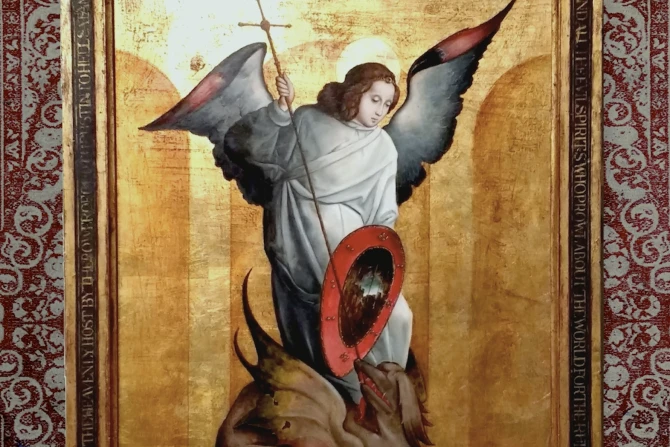 His dedication to the daily craft of producing art led recently to a 2nd place award in the Catholic Art Institute’s Sacred Art Competition. The winning piece? A dramatic depiction of St. Michael slaying the devil on a golden background in a frame he built from scratch.