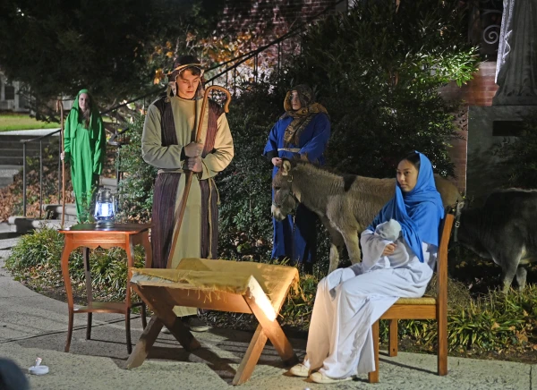 Held outside the St. Vincent de Paul Chapel, Sunday's observance featured carols and scripture readings; costumed shepherds, wise men, and the Holy Family; hot chocolate and humongous home-baked cookies … and one very cool camel, among assorted other animals.