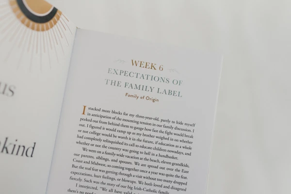 Each week begins with a short reflection or personal story from one of the writers and concludes with a scripture passage and two questions for the reader to ask herself. Along the way, artwork interrupts the text to greet readers with dusty, muted colors and shapes. The rose-gold cover impresses a feminine touch, along with a pink ribbon bookmark. Leaves and plants adorn the pages, suggesting growth and life made new.