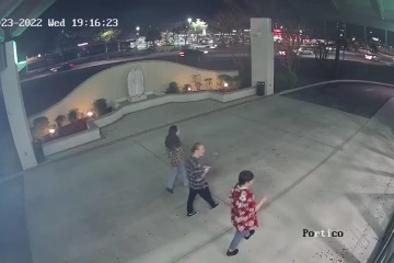 The marble statues of the Blessed Virgin Mary, the Child Jesus, and St. Joseph had either vulgar or satanic images written on them in black marker. Surveillance footage shows three people at the scene, two of whom appear to write on the statues. You can watch the church's videos of the incident here and here.
