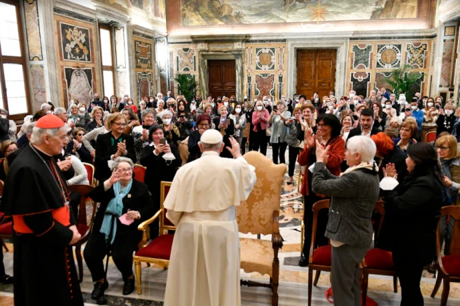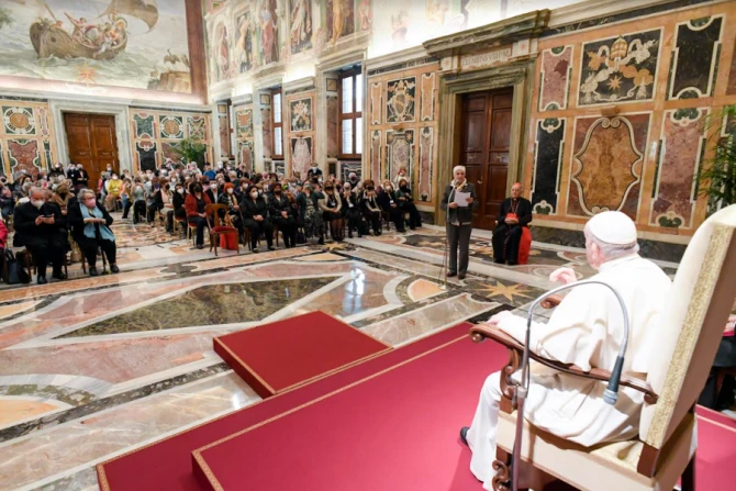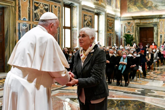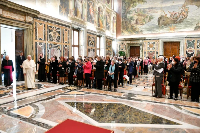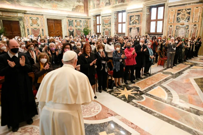 Speaking in the Vatican’s Clementine Hall, the pope went on: “Why did I want to reflect on this with you? Because you are an association of women, and women are the protagonists of this change of course, of this conversion. Provided that they are not assimilated into the prevailing power system. As long as they maintain their identity as women.”