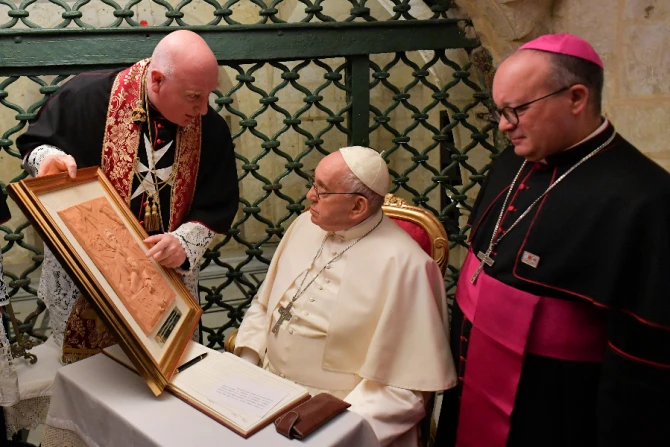 Pope Francis prayed on Sunday morning at St. Paul’s Grotto in Rabat, where local tradition holds that the Apostle lived and preached during the three months he spent on the island of Malta in 60 A.D.
