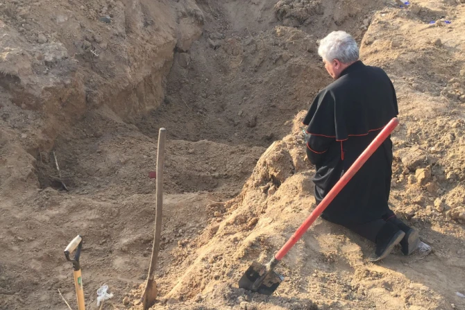 Cardinal Konrad Krajewski was pictured praying on April 15 at a grave containing 80 bodies during a visit to a newly liberated area of northern Ukraine.