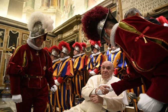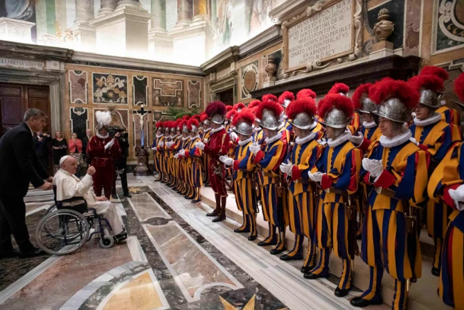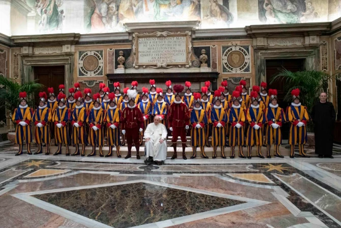In his address, Pope Francis asked Swiss Guards to pray for one of their colleagues who died recently, according to Vatican News.