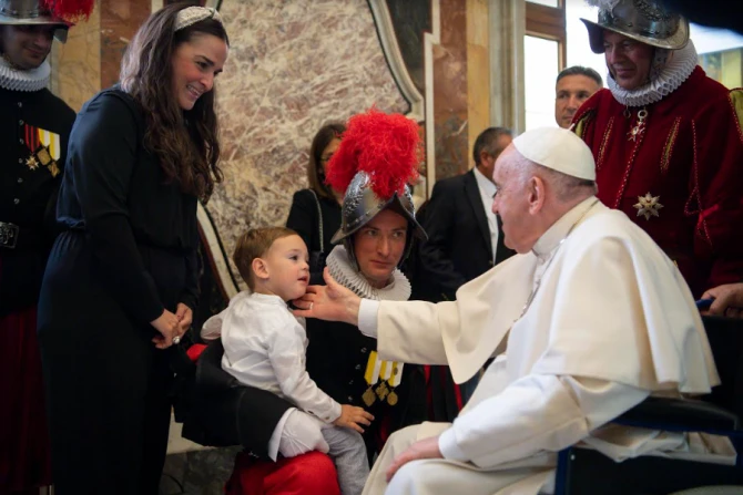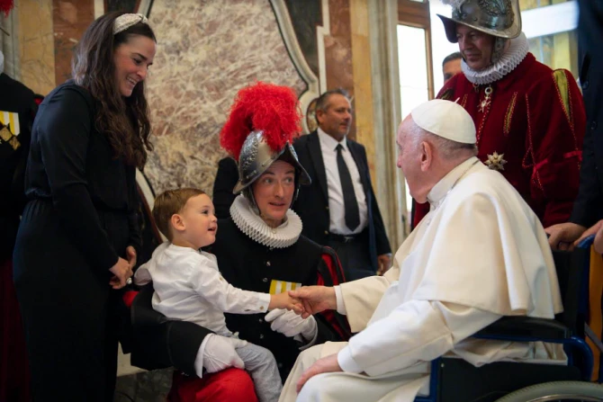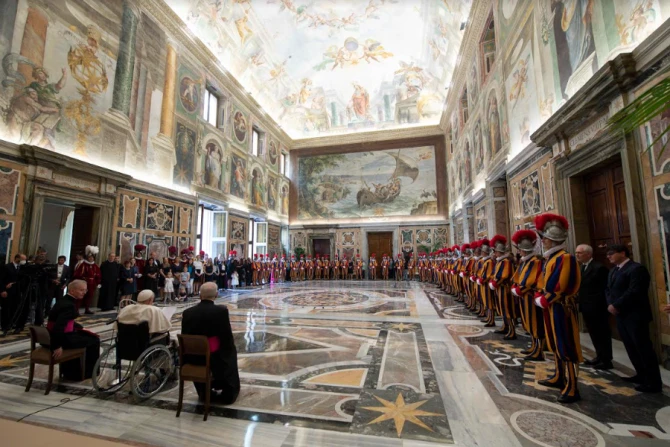 The pope, who currently uses a wheelchair due to a knee condition, met with the new candidates for the world’s smallest but oldest standing army on May 6, the day of their swearing-in ceremony.
