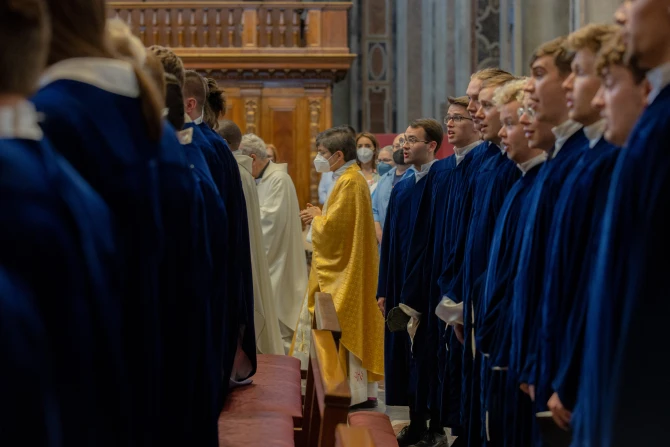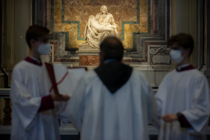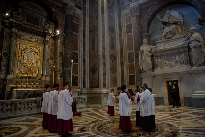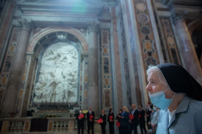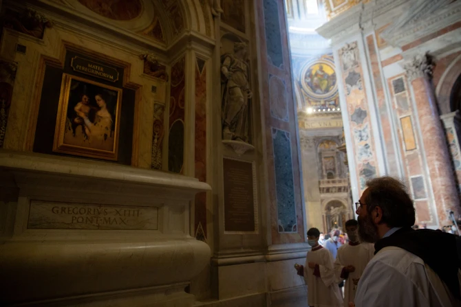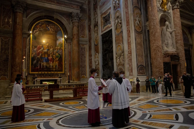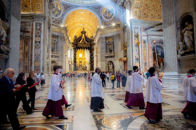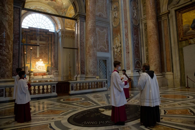 On Wednesdays during the month of May, pilgrims can gather in St. Peter’s Basilica for a prayer service honoring the Blessed Virgin Mary.