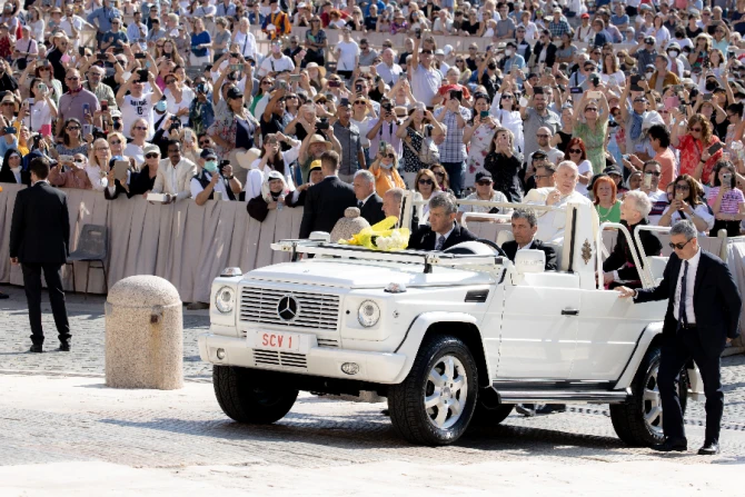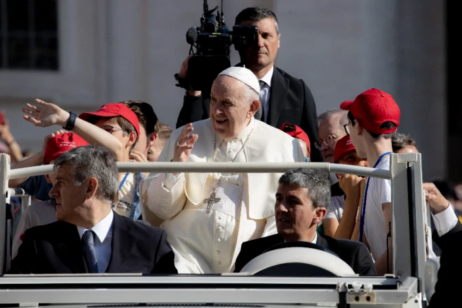 The live-streamed catechesis was the 10th in a cycle on old age that the 85-year-old pope began in February. He entered St. Peter’s Square in a white jeep, stopping to invite a group of children in red hats to join him for part of his journey past rows of pilgrims.