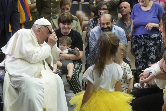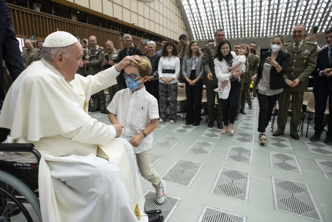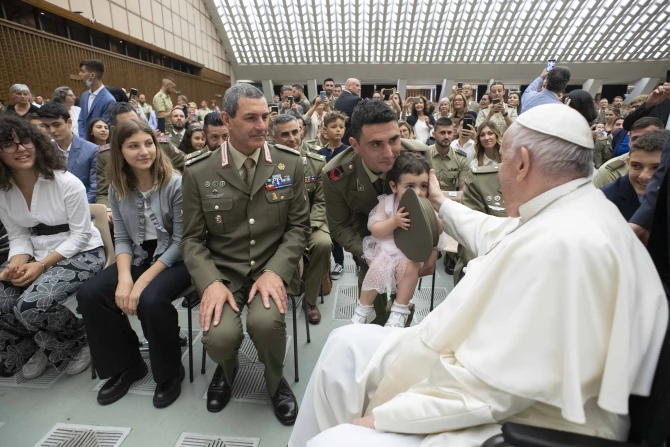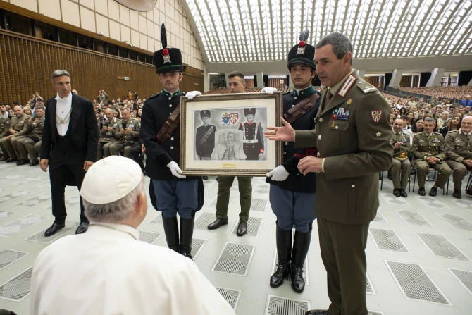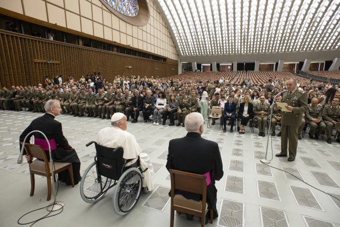 “With every exit and return to the Vatican, on apostolic trips, visits to some parish or community, I see you and give thanks to God for your dedication and presence, a garrison of security,” the pope said to military personnel on June 11 at the Vatican.