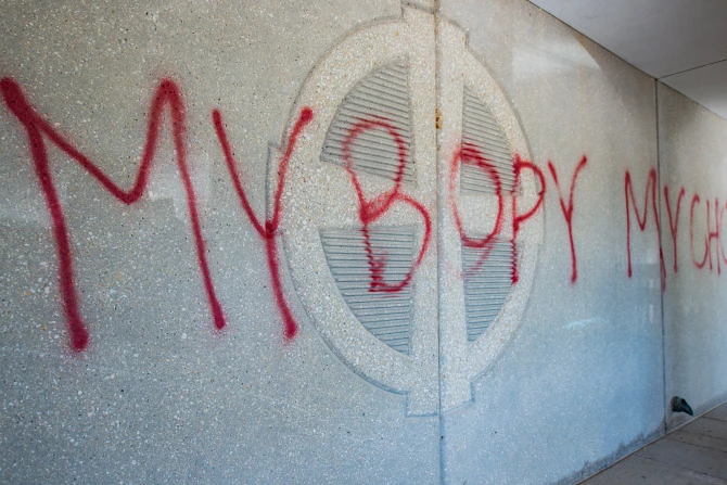 “The school's doors and building were spraypainted with hateful messaging, and a statue of Mary was also spray painted,” the newspaper tweeted. The Leaven shared photos showing the words “MY BODY MY CHOICE” spray-painted across a building in big, red lettering.