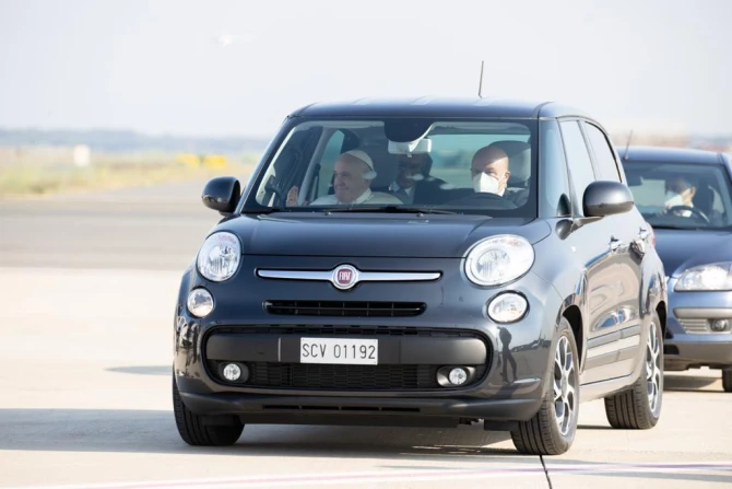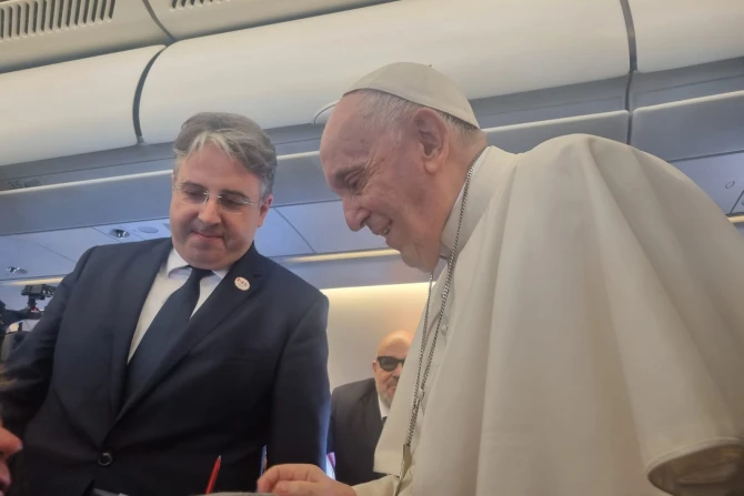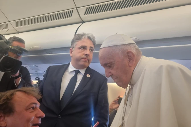 The pope was in a wheelchair when he boarded the ITA Airways plane, but he walked with a cane inside the cabin, personally greeting more than 70 journalists accompanying him on the trip.