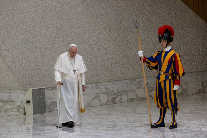 Pope Francis walked into Paul VI Hall for his Wednesday audience using a cane without assistance. The crowd cheered as the pope slowly made his way across the stage.