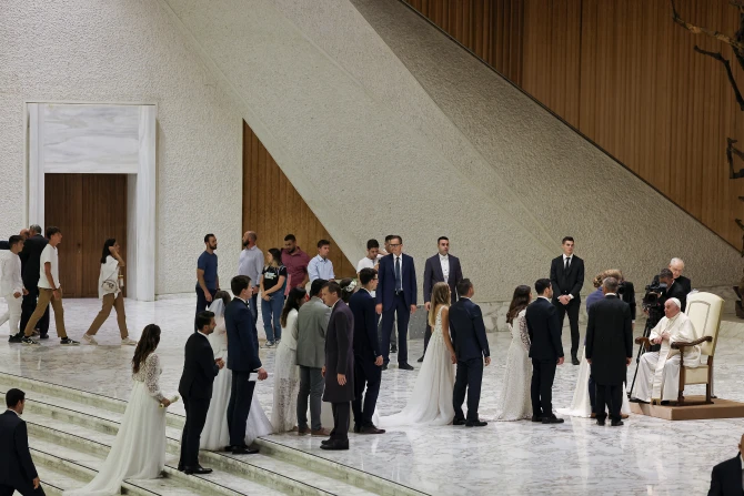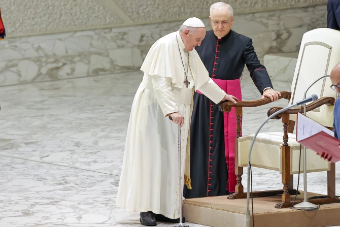 The 85-year-old Pope Francis, who usually stands for the prayer and blessing, remained seated on Aug. 17. He has been suffering from a knee injury forcing him to use a wheelchair or walk with a cane for several months.