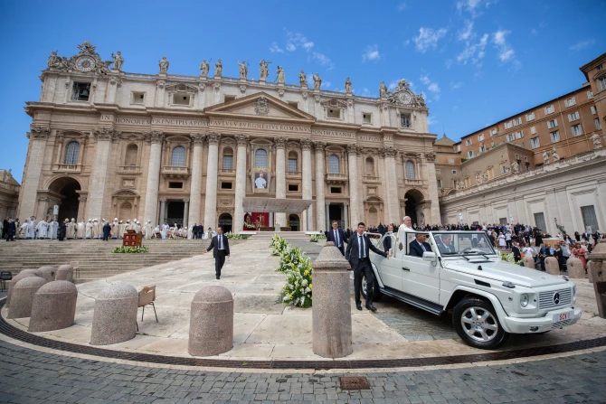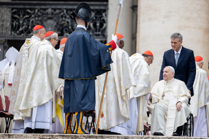 From his wheelchair, Pope Francis offered personal greetings at the end of the Mass to some of the cardinals, including Cardinal Angelo Becciu. He also greeted the crowd in the popemobile.