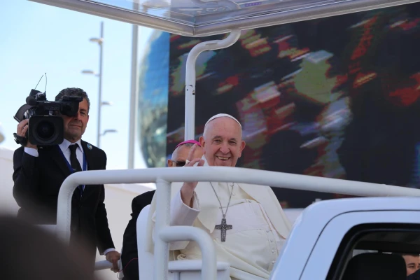 Pope Francis arrived at the expo grounds in a pickup truck popemobile, waving at the cheering crowd of several thousand.
