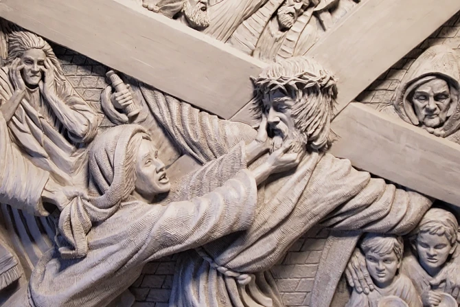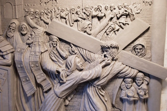 So far, he has completed the first four stations: Jesus is condemned to death, Jesus carries his cross, Jesus falls for the first time, and Jesus meets his mother.