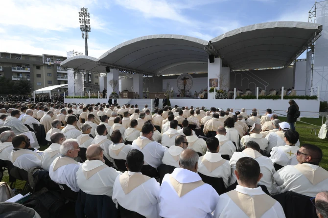 Pope Francis on Sunday traveled to the ancient Italian city of Matera, where he urged thousands of people gathered in a soccer stadium for Sunday Mass to “rediscover” Eucharistic adoration.