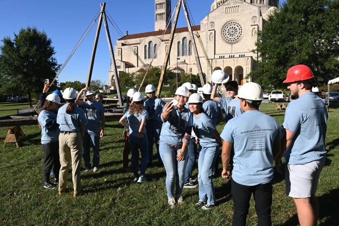 A full-scale replica of a Notre-Dame de Paris truss creaked gently in the morning sun as dozens of students and volunteers pulled on ropes to raise it above the lawn of the Catholic University of America in Washington, D.C.