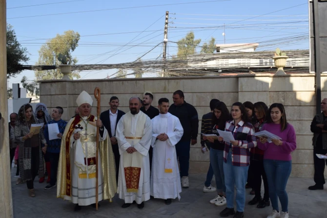 Archbishop Najeeb Michaeel, OP, the Chaldean archbishop of Mosul and Akra, led a procession to the grotto of the Virgin Mary, the patroness of Mosul, in the church courtyard before ceremoniously ringing the bell.