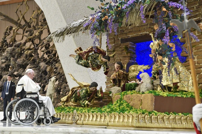 Pope Francis recommended silent prayer and contemplation of the Christ child in a Nativity scene as an intimate experience of God’s humility and tenderness.