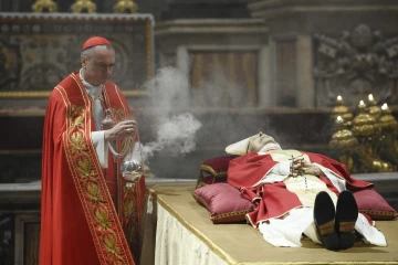 The answer appears to be a mixture of papal rites. Buried in the papal red, his body was adorned with many features reserved for a pope, but not all: the characteristic red shoes worn by Benedict as pope were replaced by black ones. In the case of official delegations, just two were invited, though any public figure can attend the event in a personal capacity.