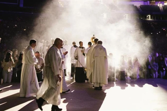 Bishop Earl Fernandes of Columbus, Ohio, celebrating the morning Mass on the first full day of the conference quoted Benedict in his 2005 encyclical Deus Caritas Est: “Being Christian is not the result of an ethical choice or a lofty idea, but the encounter with an event, a person, which gives life a new horizon and a decisive direction.”