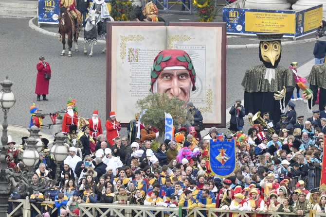 Italian pilgrims gathered at the Vatican for the pope’s Angelus message celebrated the solemnity with costumes, music, decorative banners, and a small parade in the street leading up to St. Peter’s Square.