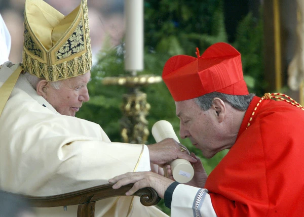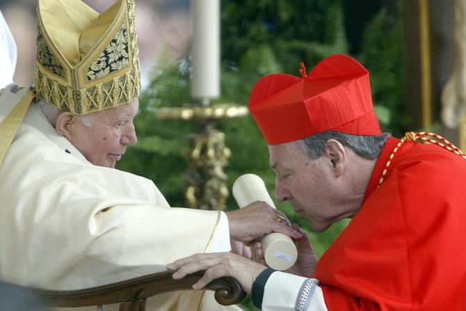 Newly appointed Cardinal George Pell of Australia kisses Pope John Paul II's hand in St. Peter's Square Oct. 21, 2003, at the Vatican during the ordination ceremony of new cardinals. | Photo by PAOLO COCCO/AFP via Getty Images