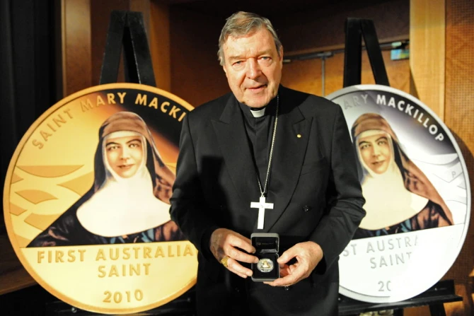 Cardinal George Pell, archbishop of Sydney, unveils Australia's first pure gold (L) and silver (R) coins commemorating the canonization of Mary MacKillop in Sydney on Sept. 30, 2010. | Photo by TORSTEN BLACKWOOD/AFP via Getty Images