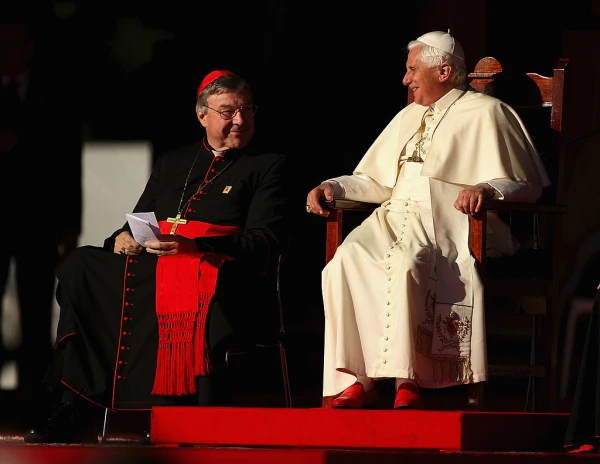 Pope Benedict XVI and Cardinal George Pell smile at one another while thanking all the volunteers at The Domain on July 21, 2008, in Sydney, Australia. | Photo by Ezra Shaw/Getty Images