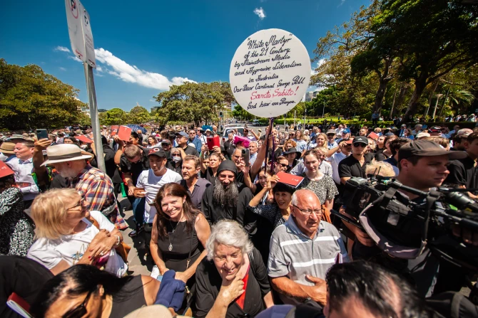 About 150 protesters critical of Cardinal Pell and Catholicism gathered outside. Some bore banners saying the cardinal should “burn in hell.” Four or five mourners objected strongly to some protesters and police intervened and arrested one man carrying a rainbow umbrella, The Catholic Weekly reported.