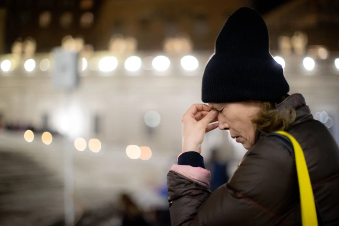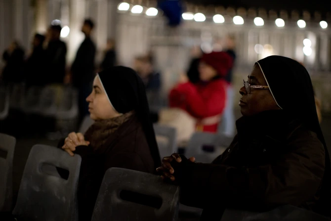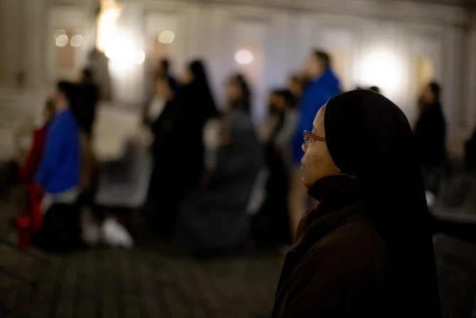 Religious sisters pray during eucharistic adoration in St. Peter's Square March 14, 2023. Daniel Ibanez/CNAA woman prays in front of the Eucharist during a holy hour in St. Peter's Square March 14, 2023. Daniel Ibanez/CNAAdorers kneel in front of the Eucharist in St. Peter's Square March 14, 2023. Daniel Ibanez/CNA